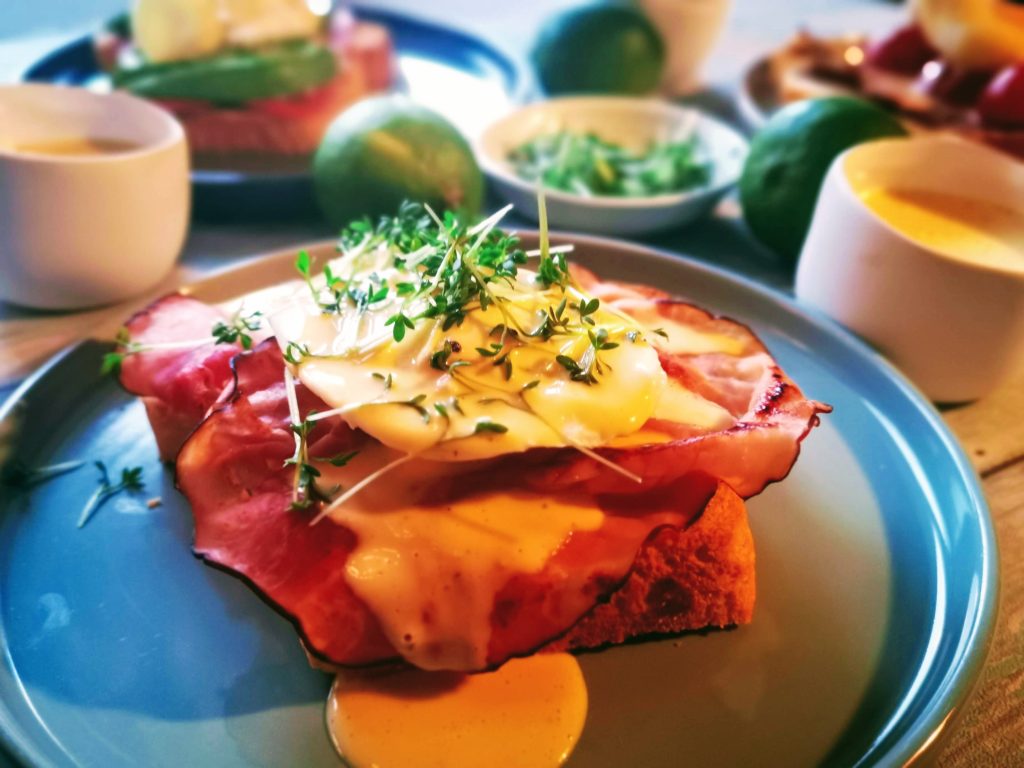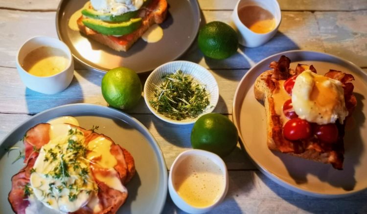 Vor 125 Jahren erfunden oder bekannt geworden (dazu gibt es unterschiedliche Meinungen) möchten wir das Jubiläum natürlich mitfeiern, und haben gleich noch zwei weitere Varianten, neben dem Klassiker, gezaubert. Während dieser mit gebratenem gekochten Schinken, pochiertem Ei und Hollandaise gemacht wird, kommen bei den „Eggs Blackstone“ Speck und Tomaten statt Schinken zum Einsatz. Die „Eggs Royal“ werden mit (Räucher-)Lachs serviert und von uns mit Avocado ergänzt. Um die Eigenheiten der beiden Variationen hervorzuheben, gibt es jeweils noch eine besondere Hollandaise. So haben wir eine BBQ Hollandaise zum Speck gemacht und zum Lachs eine Chili-Limetten Hollandaise.