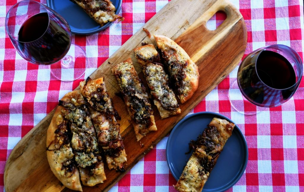 Am Tag der Verarbeitung nehmt Ihr den Teig aus dem Kühlschrank und lasst ihn 1 Stunde akklimatisieren (warm werden). In der Zeit den Ofen inklusive Pizzastein auf 250°C vorheizen. Dann schneidet Ihr die Zwiebeln in dünne Scheiben. Öl etwas erhitzen und die Zwiebeln für 10 Minuten goldbraun anschwitzen. Platte auf höchste Stufe drehen, die Zwiebeln mit dem Zucker karamellisieren und mit Rotwein ablöschen. Etwas Salz und Pfeffer dazu geben und solange weiter garen, bis der Rotwein verkocht ist. Zwiebeln zur Seite stellen, den Mozzarella in kleine Stücke hacken und mit einem Küchentuch die Feuchtigkeit aufsaugen.
