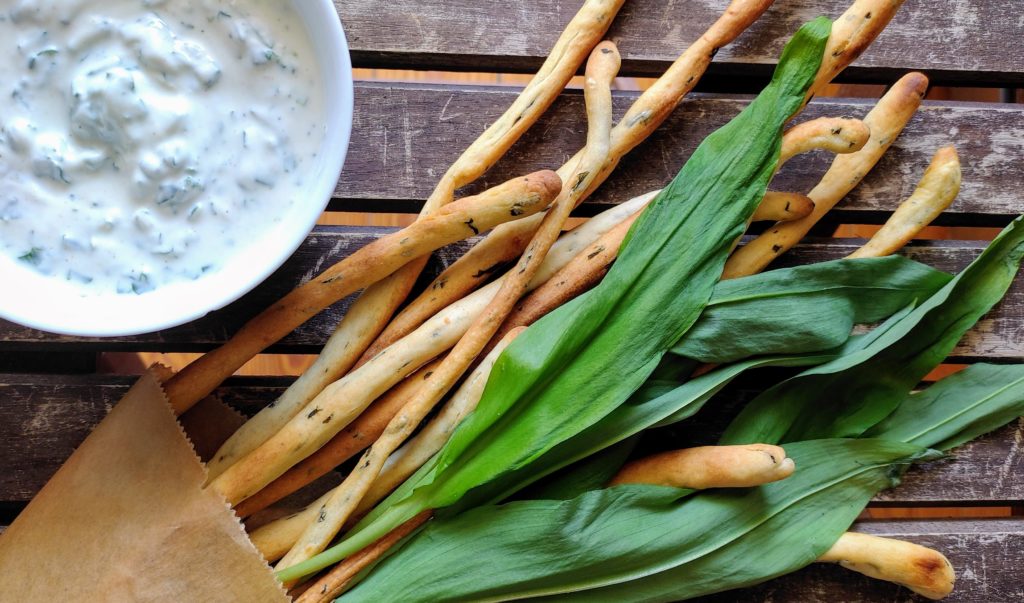 Bärlauch-Sauerteig-Grissini mit Bärlauch Dip