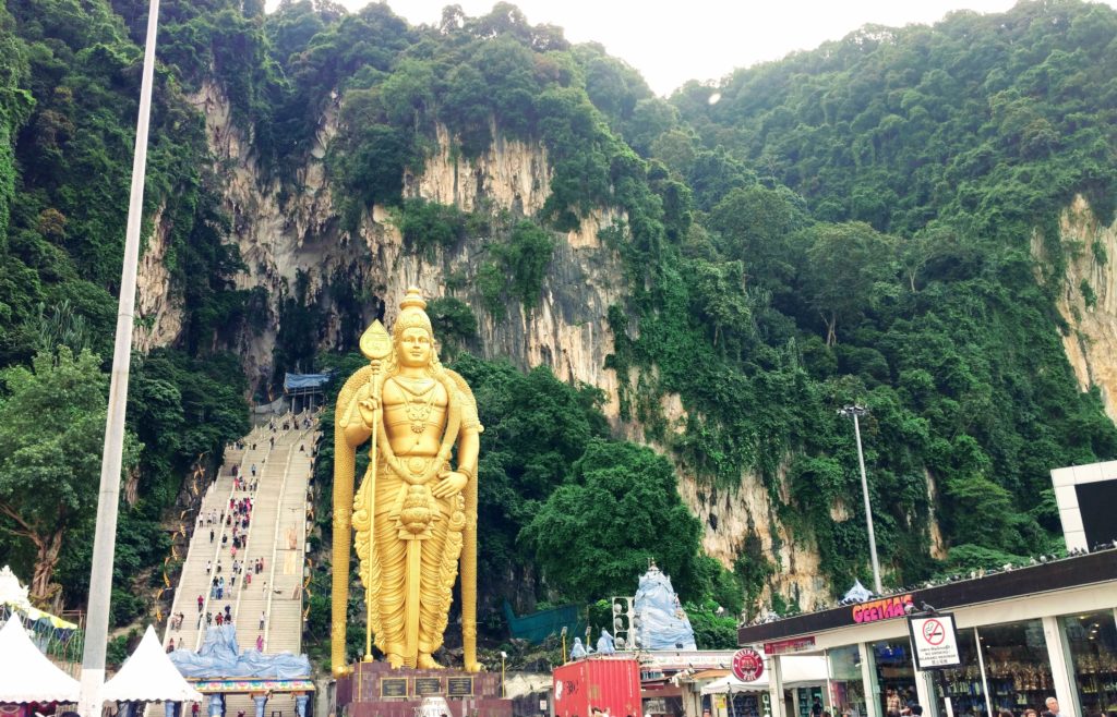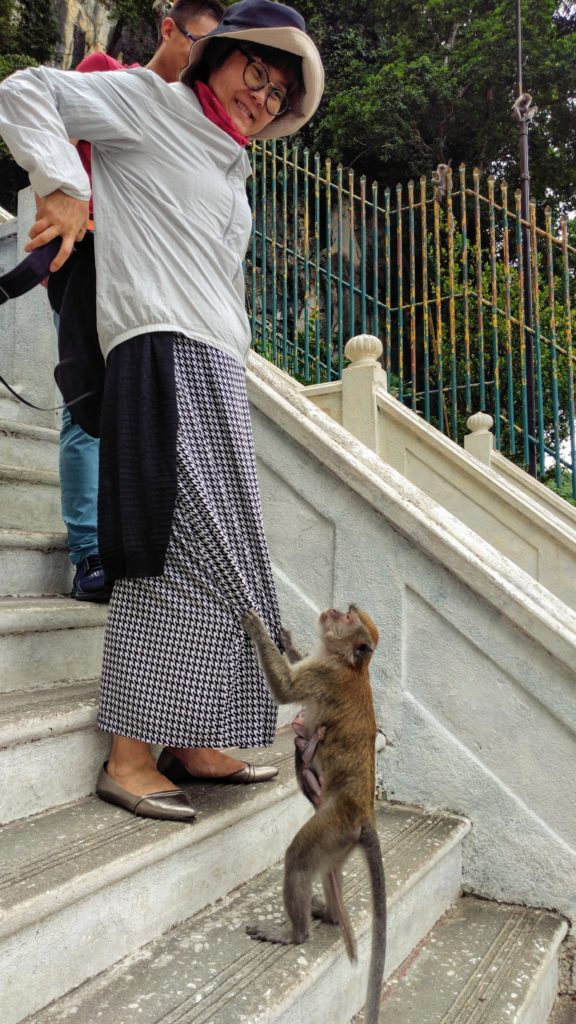 Am nächsten Tag ging es zu den beeindruckenden Batu Caves. 272 Stufen und zwei kleine Kinder… Und wer war als erstes oben? Ich war es nicht. Volker auch nicht…. Wir schleppten im Wechsel das kleine Kind… Und hatte ich schon erwähnt, dass ich Affen gar nicht so gerne mag? Hier sitzen sie nämlich überall auf der Treppe und lauern auf die Kekse und Nüsse der Besucher.