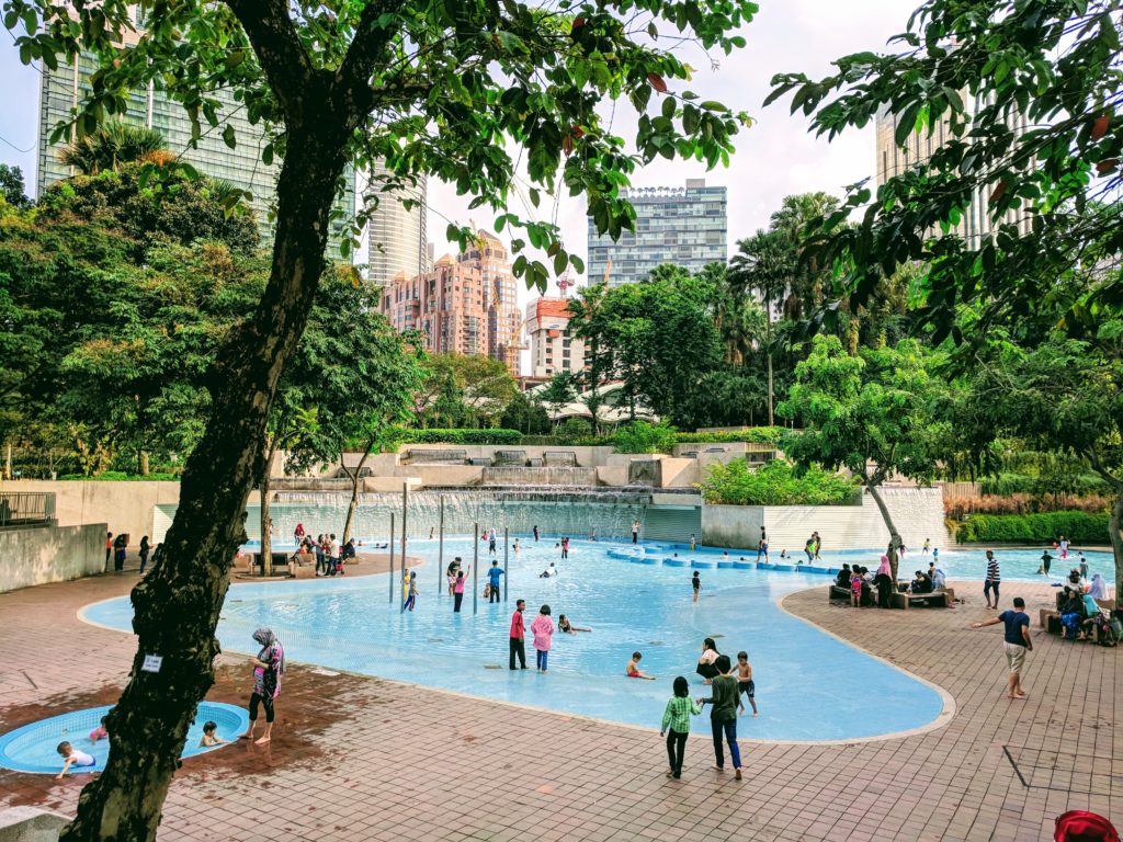 Mir war vorher nicht bewusst, dass KL (ich kürze ab jetzt mal ab) stark islamisch beeinflusst ist. Und teilweise fühlte man sich wie in Istanbul (sehr sympathisch). Nachdem wir uns Eintrittskarten für die Petronas Towers für zwei Tage später geholt hatten, entdeckten wir den wunderhübschen KLCC Park, der sich hinter diesen befindet. Und plötzlich tauchte es auf, das Paradies für unsere Kinder….