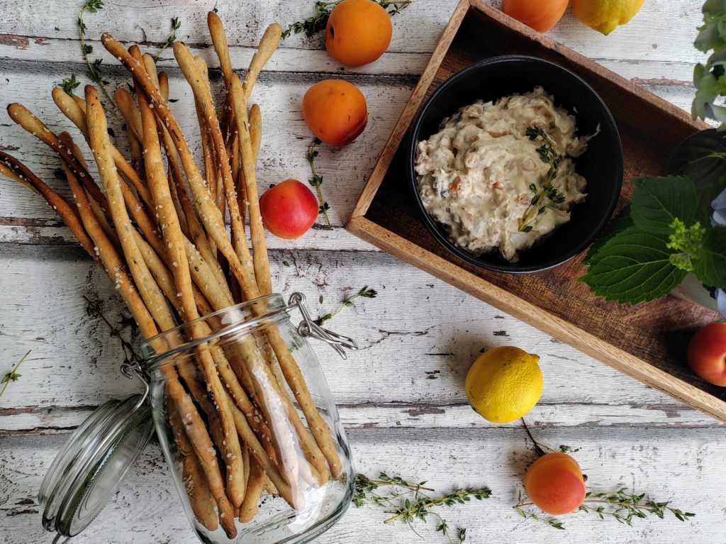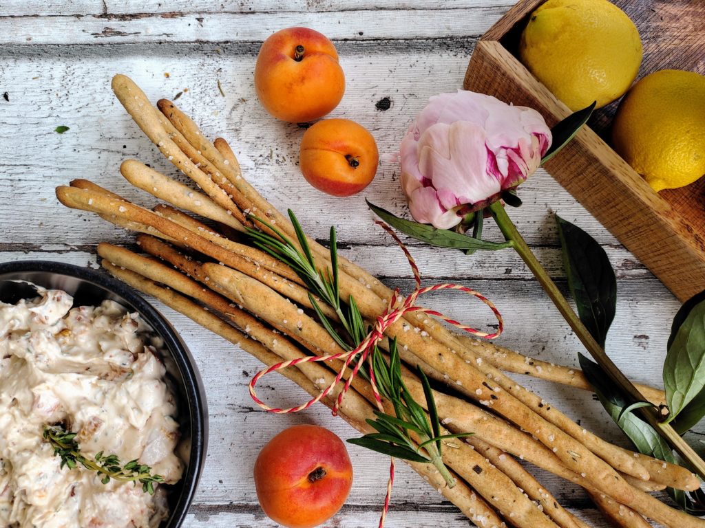 Ich lasse die Grissini lieber etwas länger im Ofen, damit sie schneller durchtrocknen. Danach lassen sie sich perfekt zum Dippen verwenden. Z.B. in den Aprikosen-Thymian-Dip oder dem sizilanischen Albrotpesto.