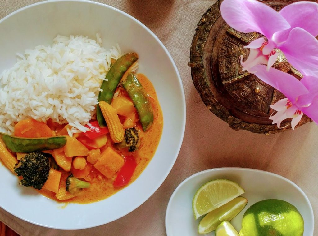 Zuerst das Gemüse in den Wok, das am längsten braucht, um gar zu werden. Bei uns also Möhren, Kartoffeln und Süßkartoffeln (die brauchen länger als man denkt). Diese brate ich kurz an, bis sie ein wenig Farbe bekommen. Danach wird mit Kokosmilch und -ganz wichtig- Orangensaft abgelöscht. Nach 10 Minuten köcheln, kommen Brokkoli, Maiskolben und Kichererbsen dazu. Nun wird gewürzt. Ingwer reiben, Knoblauch pressen, Currypaste, Erdnussbutter, Tomatenmark, Currypulver, Salz und Pfeffer dazu und weitere 20 Minuten kochen lassen. Probiert das Gemüse lieber einmal mehr, als zu wenig. Gar sollte es sein, aber nicht verkocht. Und immer mal wieder umrühren, da die Erdnussbutter sich sonst nicht so gut auflöst. Ganz zum Schluss kommt die Paprika und die Zuckerschoten dazu.