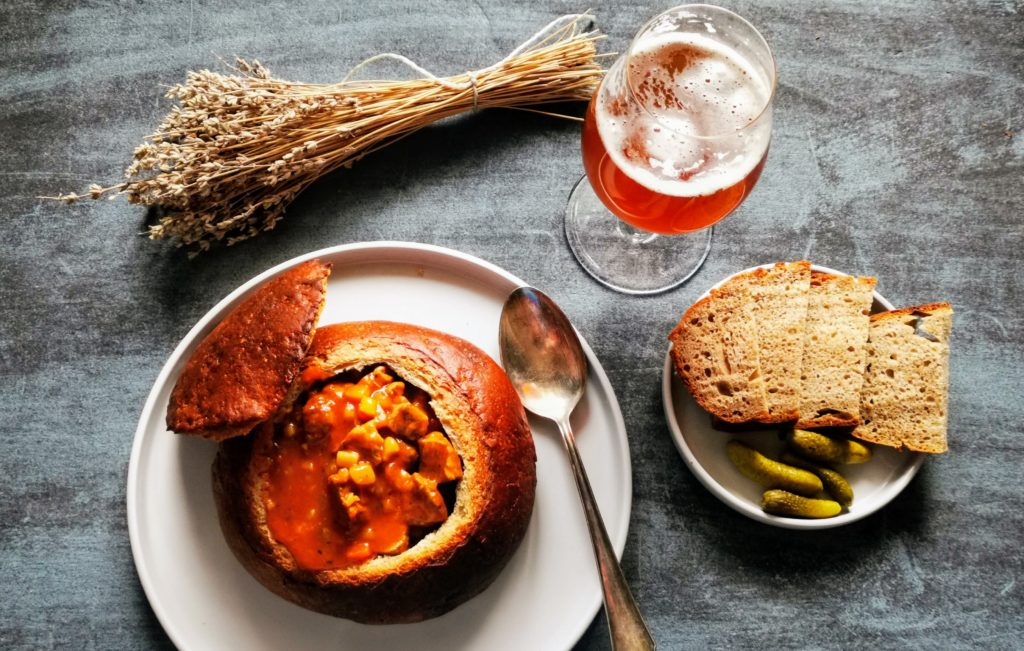 Nun in der Brotschüssel anrichten. Dafür ein 400-500gr rundes Brot von Innen aushöhlen und mit Gulasch füllen.